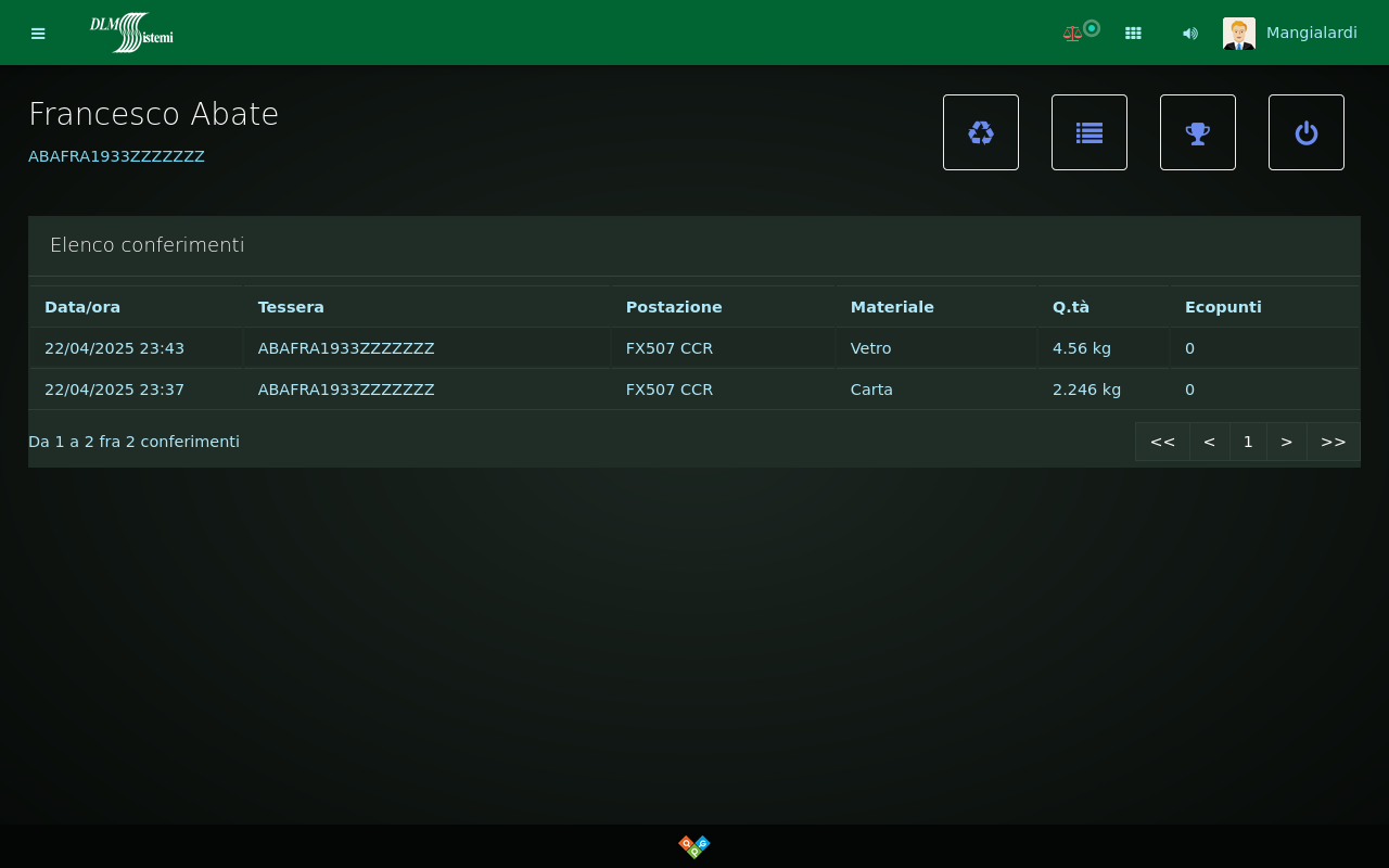 La pagina mostra l'elenco di tutti i conferimenti effettuati dall'utente incluse le informazioni su materiale, quantità ed eventuali ecopunti associati a programmi di premialità.