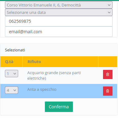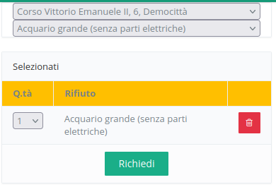 Selezionare l'indirizzo di ritiro, aggiungere gli ingombranti dal selezionandoli dal menu, ed al termine cliccare su RICHIEDI